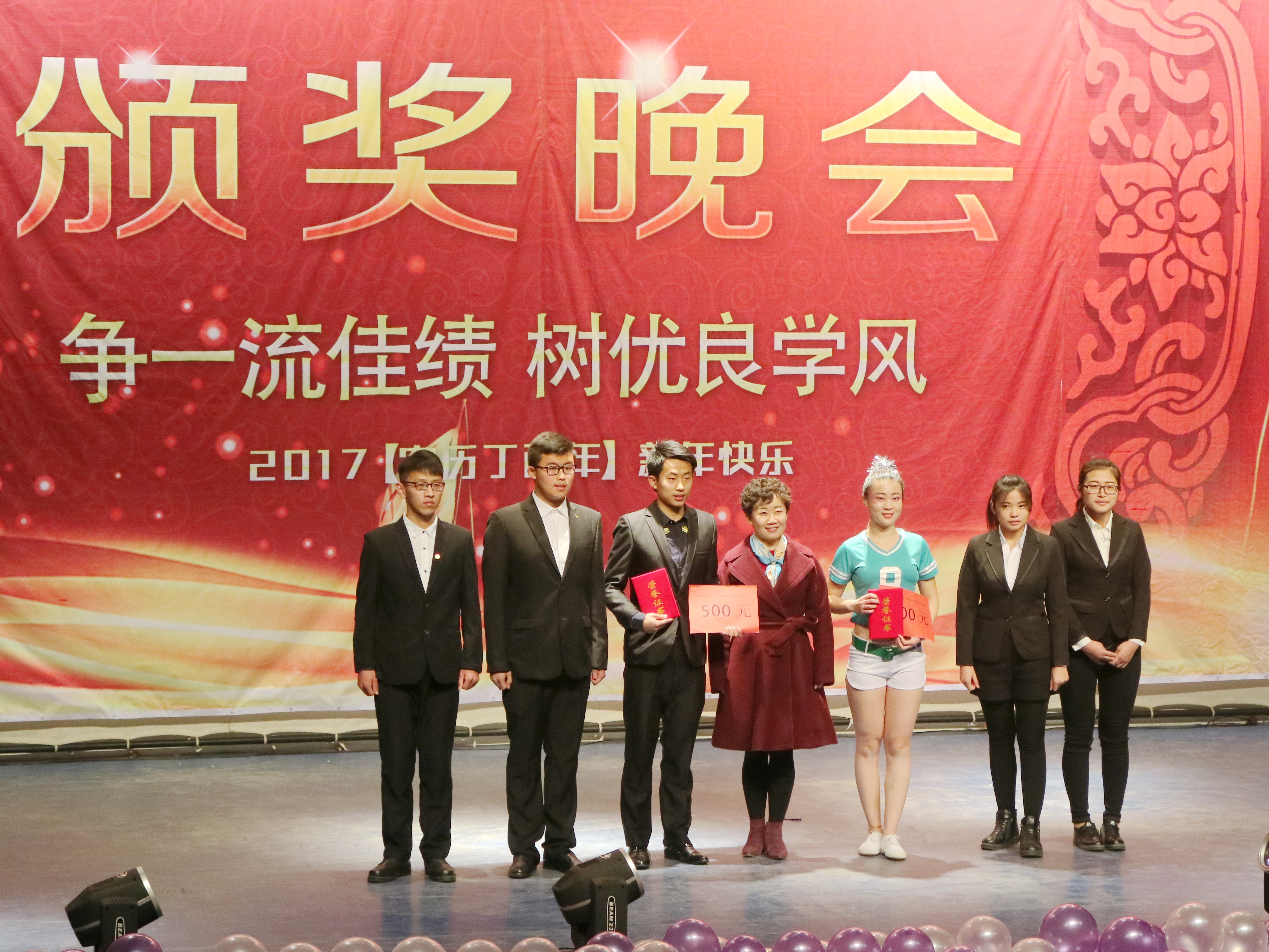 体育学院紧抓学风建设,通过智育成绩评选出了十佳学习标兵,给予现金奖励,树立了学习榜样。重视创新创业教育,其中两个团队注册了公司,受到了重点表彰,颁发了奖金和荣誉证书。此外,明净教室、宿舍安全等评选出了十八个团体受到了表彰。晚会开始随着大屏幕上倒计时的出现,气势恢宏的舞狮跃上颁奖晚会的舞台,四头活灵活现的“大狮子”摇头、摆尾、跳上、蹿下、转圈等一系列的动作让观众目不暇接;接着是洋溢着青春气息,充满活力的啦啦操表演,充满着节奏感的音乐与舞姿交相辉映,完美诠释了“青春就要不服输”的精神;接下来是歌曲串烧的演唱者们用歌声演绎了《青春体育》,带动全场的氛围;然后是小品《真假贵妃》,演员的精湛演技和故事情节让观众眼前一亮,不时引来阵阵叫好声。毛伟民老师演唱的《霸王别姬》将全场气氛推向高潮,不时与观众的互动赢得阵阵喝彩声;优雅而浪漫的瑜伽带给人意犹未尽的视觉体验,高难度的支撑、跨越动作让观众目不暇接;舞蹈串烧《Jazz dancing》动感十足,瞬间引爆全场;手语《相爱小幸运》温暖人心,手部语言也有它的独特魅力;小品《九儿》感动全场,令人唏嘘不已;最后,体育学院2017年元旦颁奖晚会在一曲《再见》中隆重落下了帷幕。