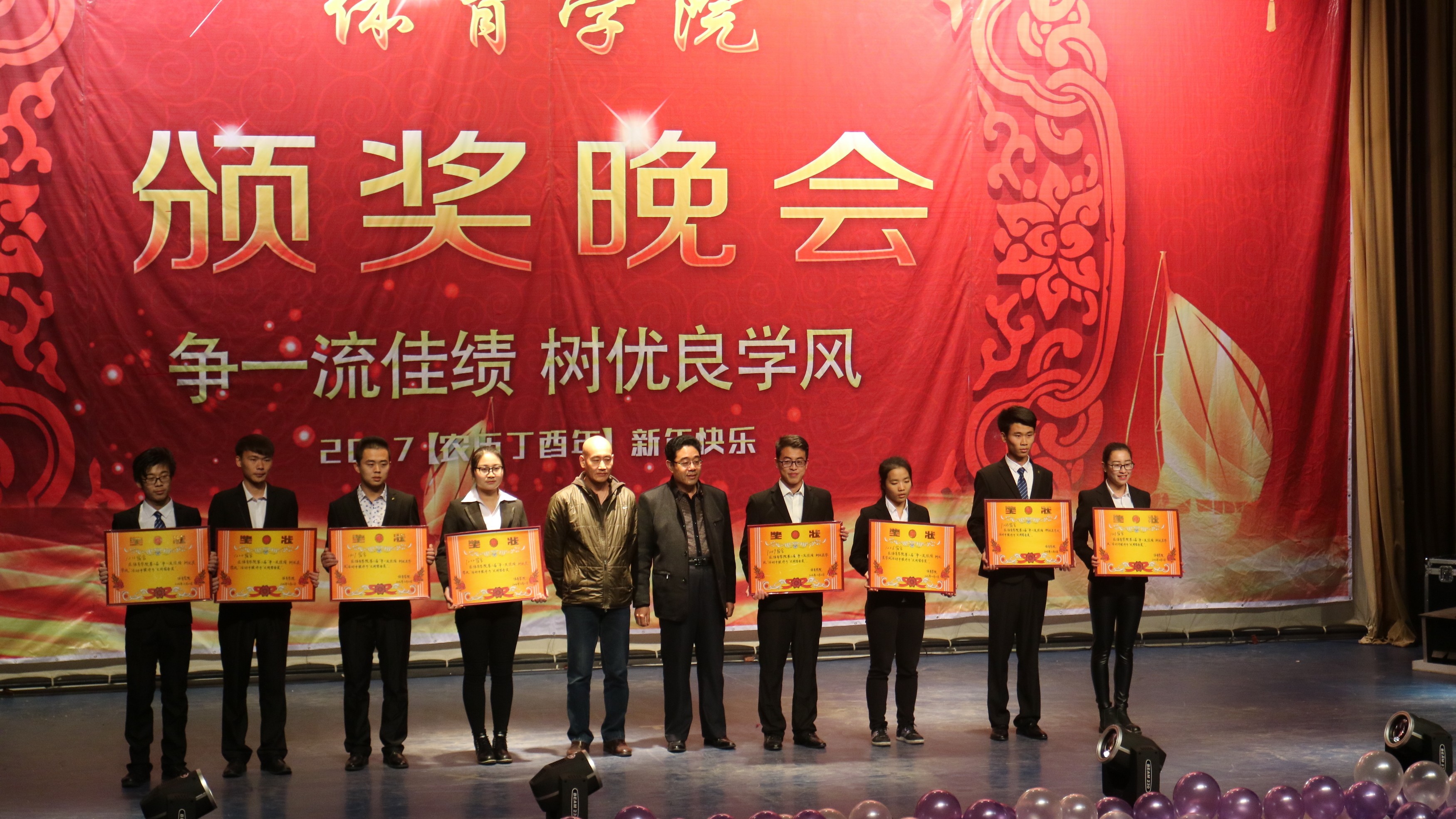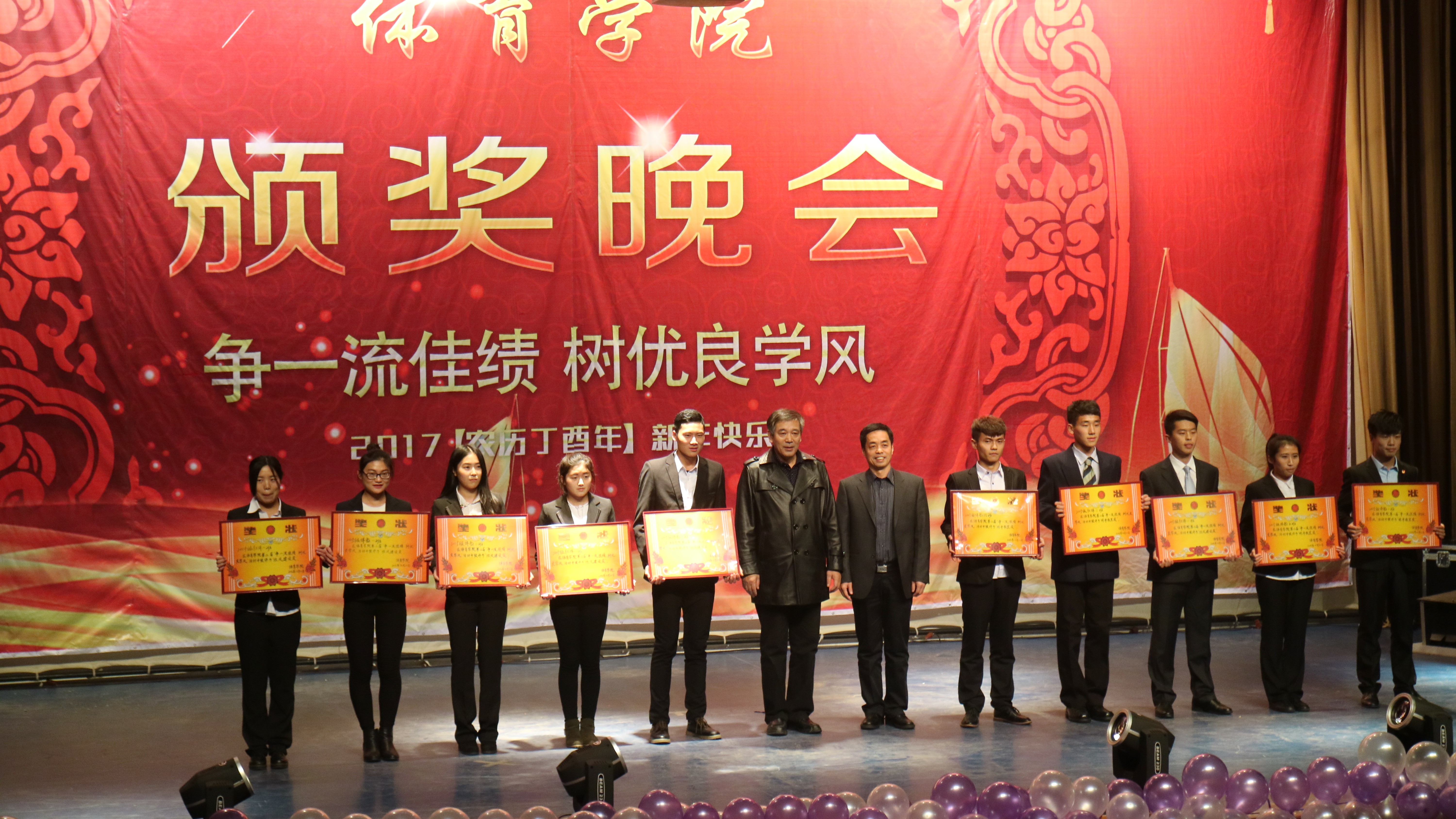 2016年12月22号晚7点,在潍坊学院图书馆报告厅,体育学院“争一流佳绩,树优良学风”2017年颁奖暨元旦晚会拉开了帷幕。出席本次颁奖晚会的颁奖嘉宾有潍坊学院副校长王清明、宣传部副部长于恬及体育学院全体班子成员。晚会现场有体育学院三个年级的学生和部分教师代表。