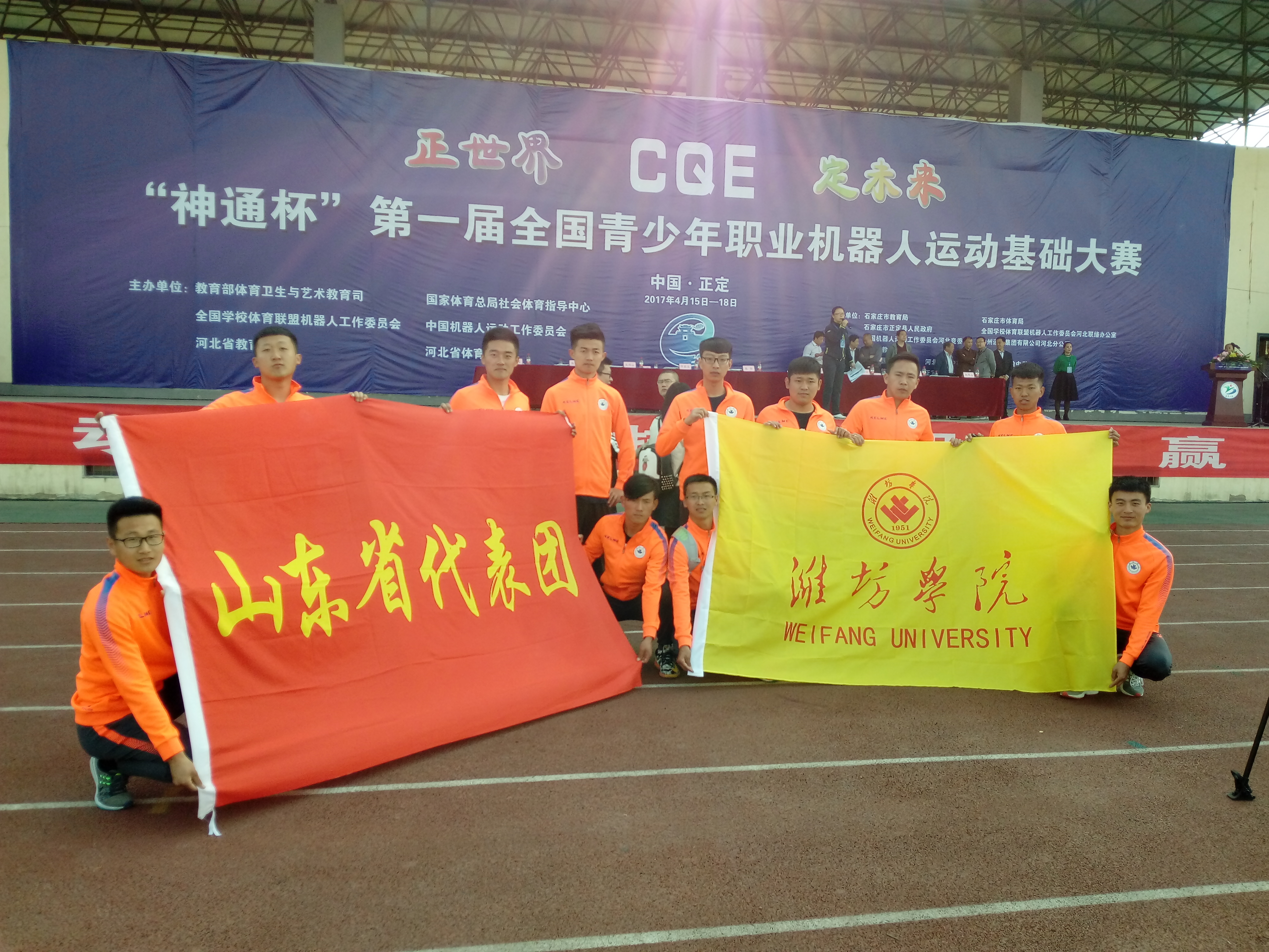 由教育部体育卫生与艺术教育司和国家体育总局社会体育指导中心主办的第一届全国青少年职业机器人运动基础大赛。于2017年4月15日至18日在河北省正定县举行,潍坊学院代表队,由体育学院院长赵健教授任领队,团总支书记卢永波任教练,带领体育学院李金星、许朝廷、刘冰洁、张善猛、刘昌、李超、郑崇阳、王成鹏、周涵、朱志元、李先进十一名队员组建的两支机器人马球队参加比赛。经过几天激烈的角逐,潍坊学院求是,创新队两支马球队成功会师决赛。