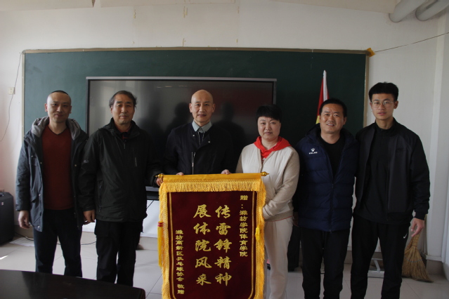 3月30日,潍坊市高新区乒乓球协会会长吴春芳一行到体育学院赠送“传雷锋精神 展体院风采”的锦旗,体育学院副院长耿道熙代表学院接受锦旗,双方在体育学院会议室进行了交流。高新区乒协副会长单庆丰、逄国辉,体育学院团总支书记卢永波,学生代表尹庆坤参加了交流。