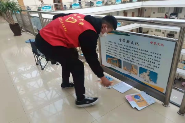 活动开始前,爱心服务队队员们认真聆听负责人的介绍与要求,注意疫情防控戴好口罩的同时做到安静清扫。活动期间,队员们也分工明确,各司其职,打扫卫生的同时尽量避免打扰到学习的同学。拿起清扫工具清理纸屑、扫揽垃圾废物;弯腰随手捡起桌子或地面上的垃圾;将走廊上的桌椅摆弄整齐;在看到走廊上有放置杂乱的书籍时会帮忙整理并放回原处。队员们安静而又迅速的清扫得到了同学的认可和支持,他们或是露出赞许的笑容,或是道一声衷心的感谢,这对队员们来说亦是一种莫大的鼓励与支持。