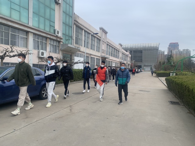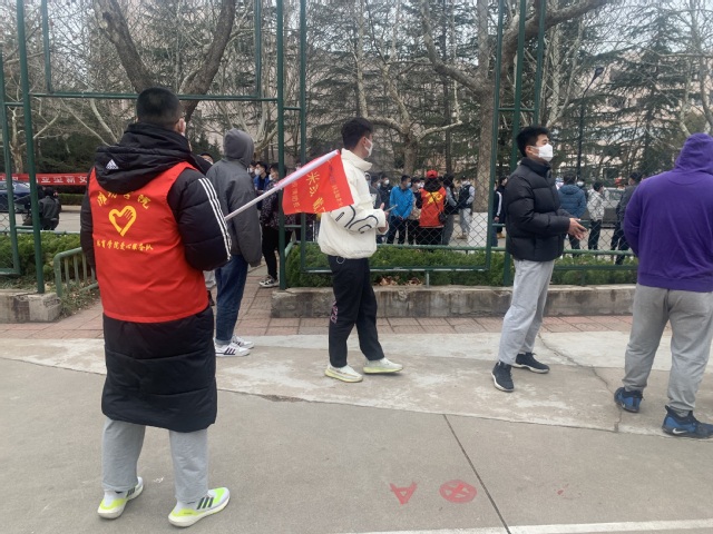 在核酸检测现场,体育学院疫情防控学生干部先锋队全部到岗,各班级有组织、有纪律地在体院小广场集合后,在志愿者的指挥引导下,有序进入风雨篮球馆进行核酸检测。志愿者们时刻提醒同学们“保持1米线,有序排队,准备好信息采集二维码”,有效提高了检测效率。期间,学院党总支书记李秋之、党总支副书记王松森、团总支书记卢永波以及2018级辅导员战新军老师亲临现场组织。核酸检测结束后,卢永波和战新军老师在体育楼前集合先锋队员们召开总结会,对此次核酸检测过程中发现的问题进行总结,并在原有运行机制的基础上,进行优化升级。