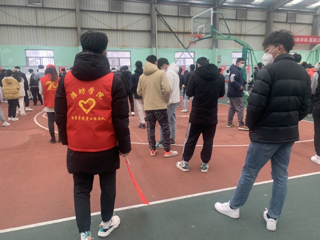近期,潍坊疫情形势较为严峻,为落实相关疫情防控工作要求,切实保障学校师生身体健康和生命安全,3月17日,学校组织在校师生进行了第三次全员核酸检测筛查,面对疫情,体育学院疫情防控学生干部先锋队积极投入志愿服务,助力核酸检测工作。