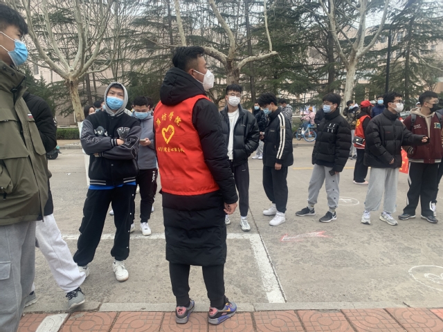 自3月11日起,他就一直坚守在体育学院辅导员办公室,配合老师完成“应检尽检”摸排工作,协助老师进行各种报表填写,组织学院同学有序参加核酸检测。每次核酸检测,他都会组织参检学生到指定地点按照“一米线”排队,清点人数,维持秩序,提醒同学们提前打开手机的二维码,引导同学们进行核酸检测。