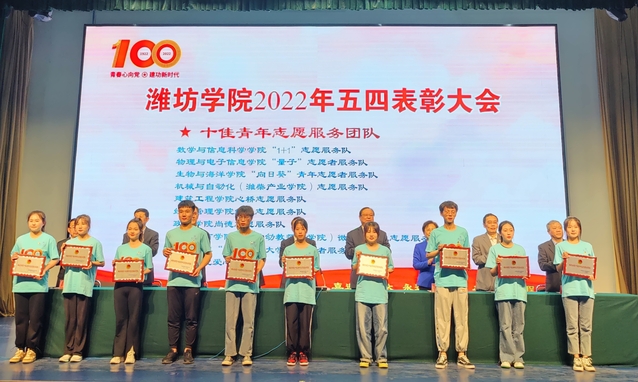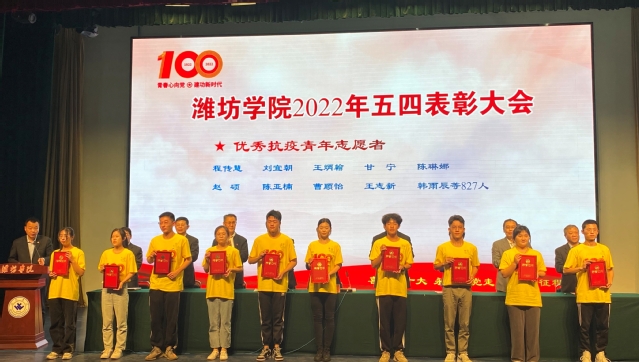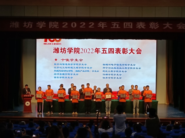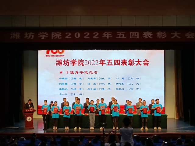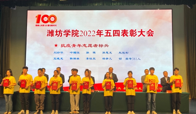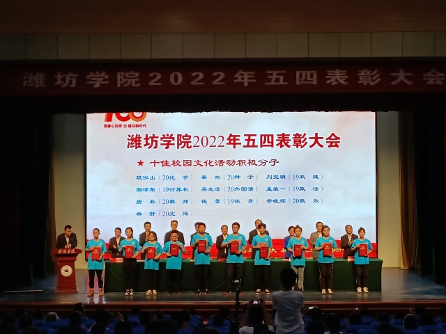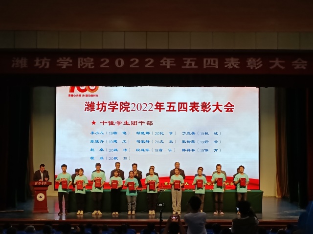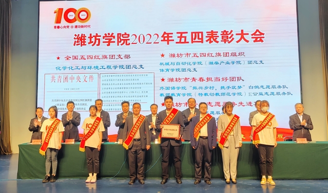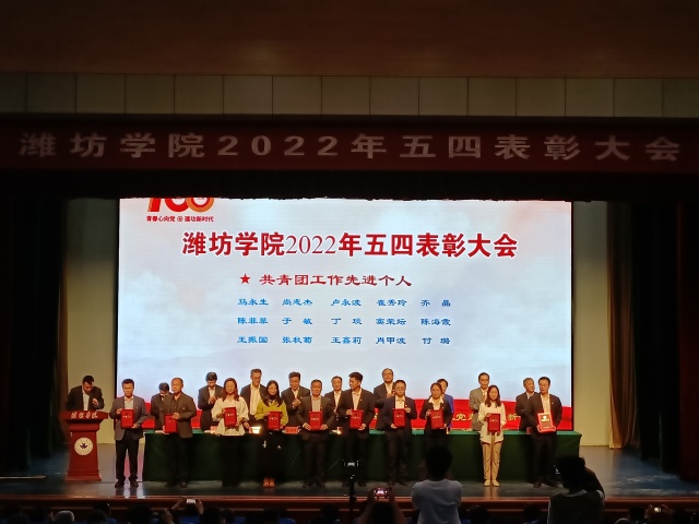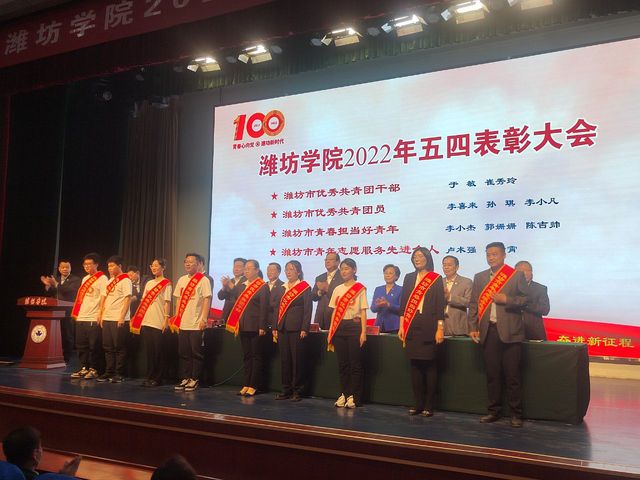 在中国共产主义青年团建团一百周年之际,为持续弘扬五四精神,表彰模范先进典型、营造向榜样看齐的氛围,引领广大团员青年在青春的赛道上奋力奔跑,潍坊学院于5月2日在图书馆报告厅举行了“潍坊学院2022年五四表彰大会”。