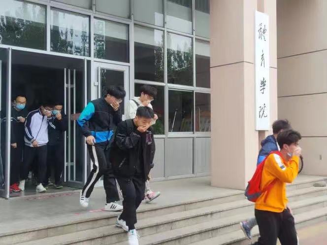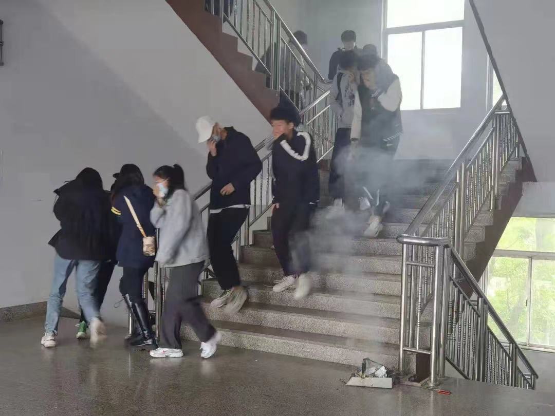 随着警报的拉响,演练正式开始,参演的同学们按照应急疏散预案,快速有序跑出教室,沿着指定路线用湿毛巾捂住口鼻,弯腰疾行迅速向体育楼前小广场撤离。整个演练活动快速有序,全部用时2分钟。演练结束后,王祥博同学对此次应急疏散演练进行了简要总结并向同学普及在突发意外事件时的应急知识。