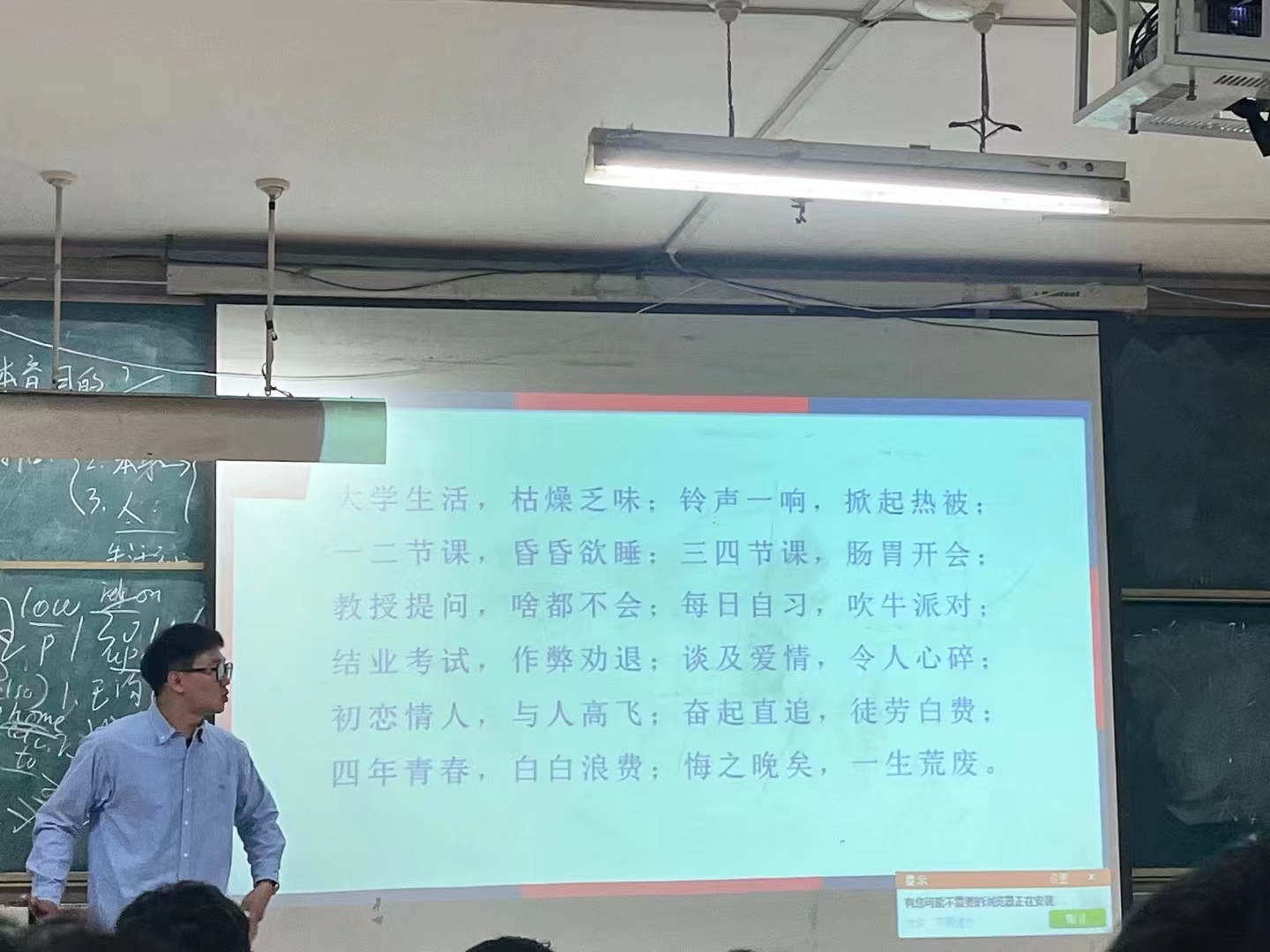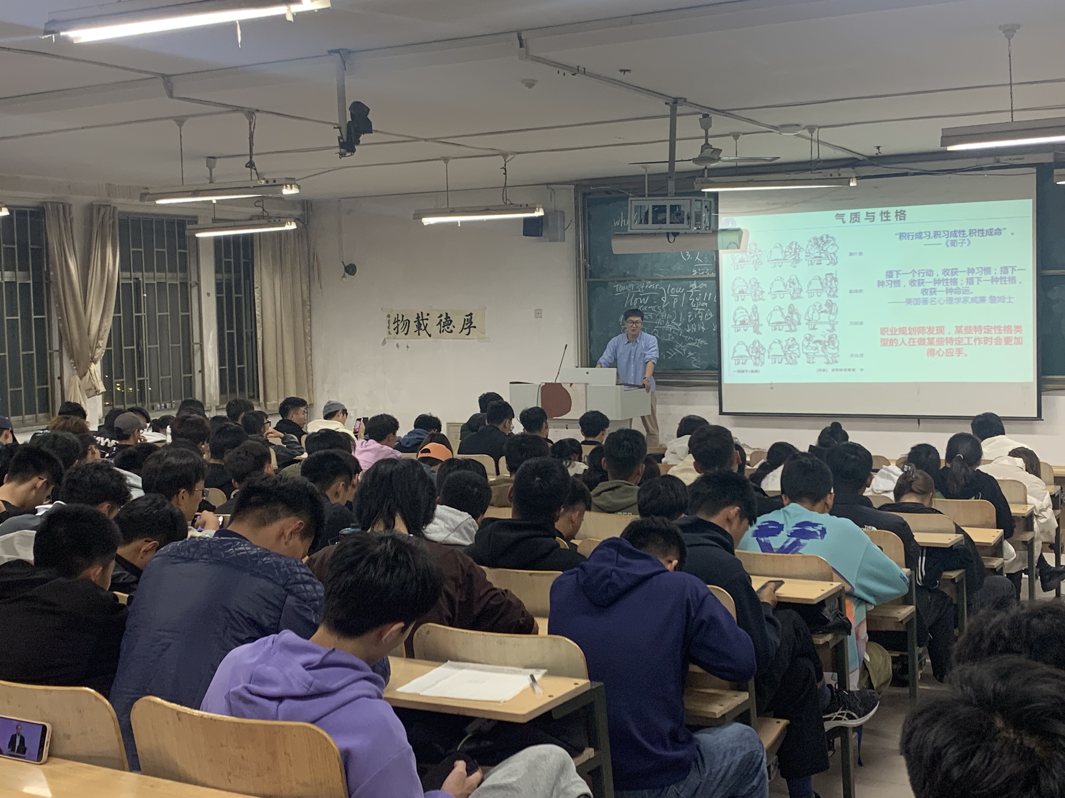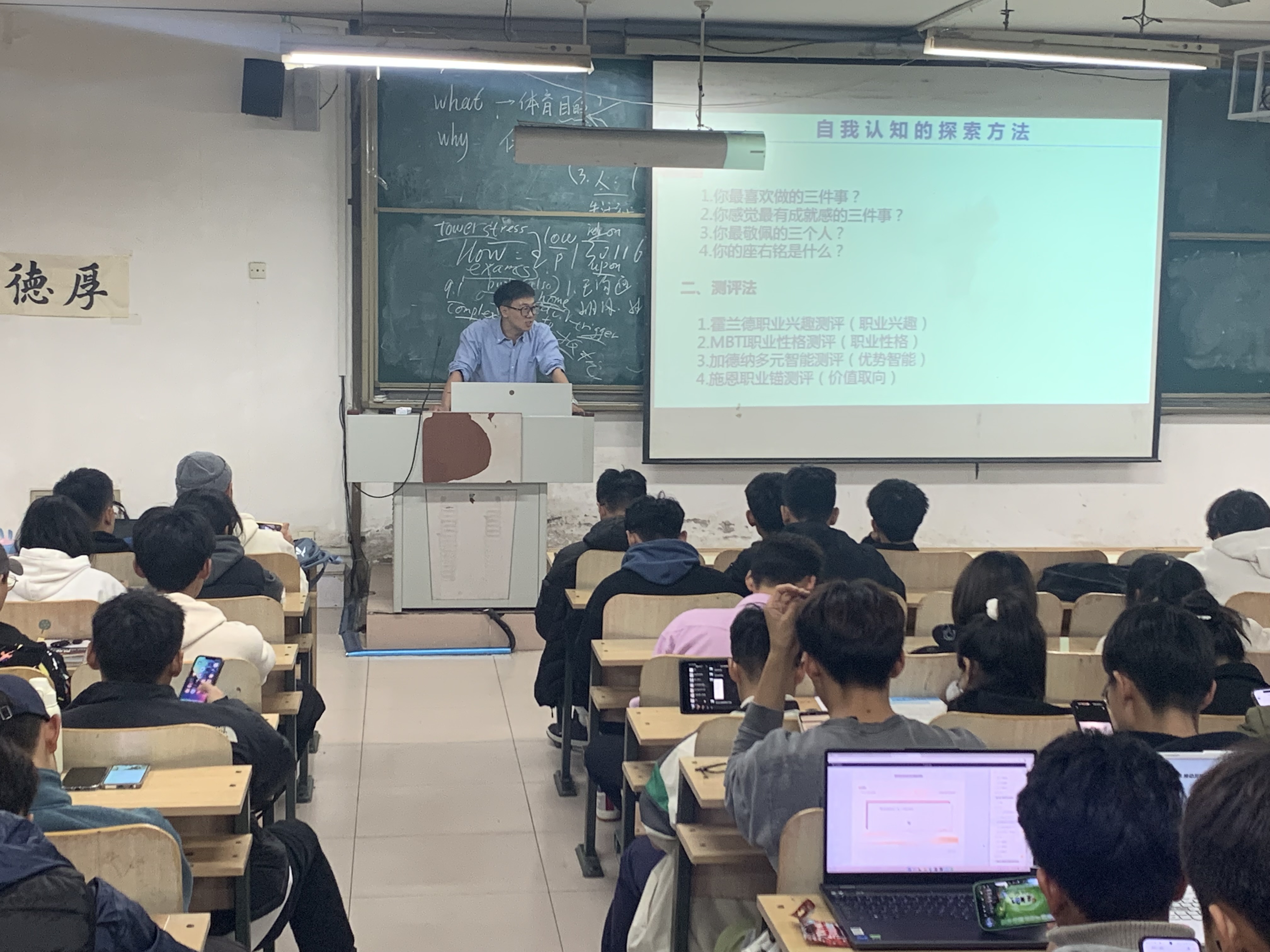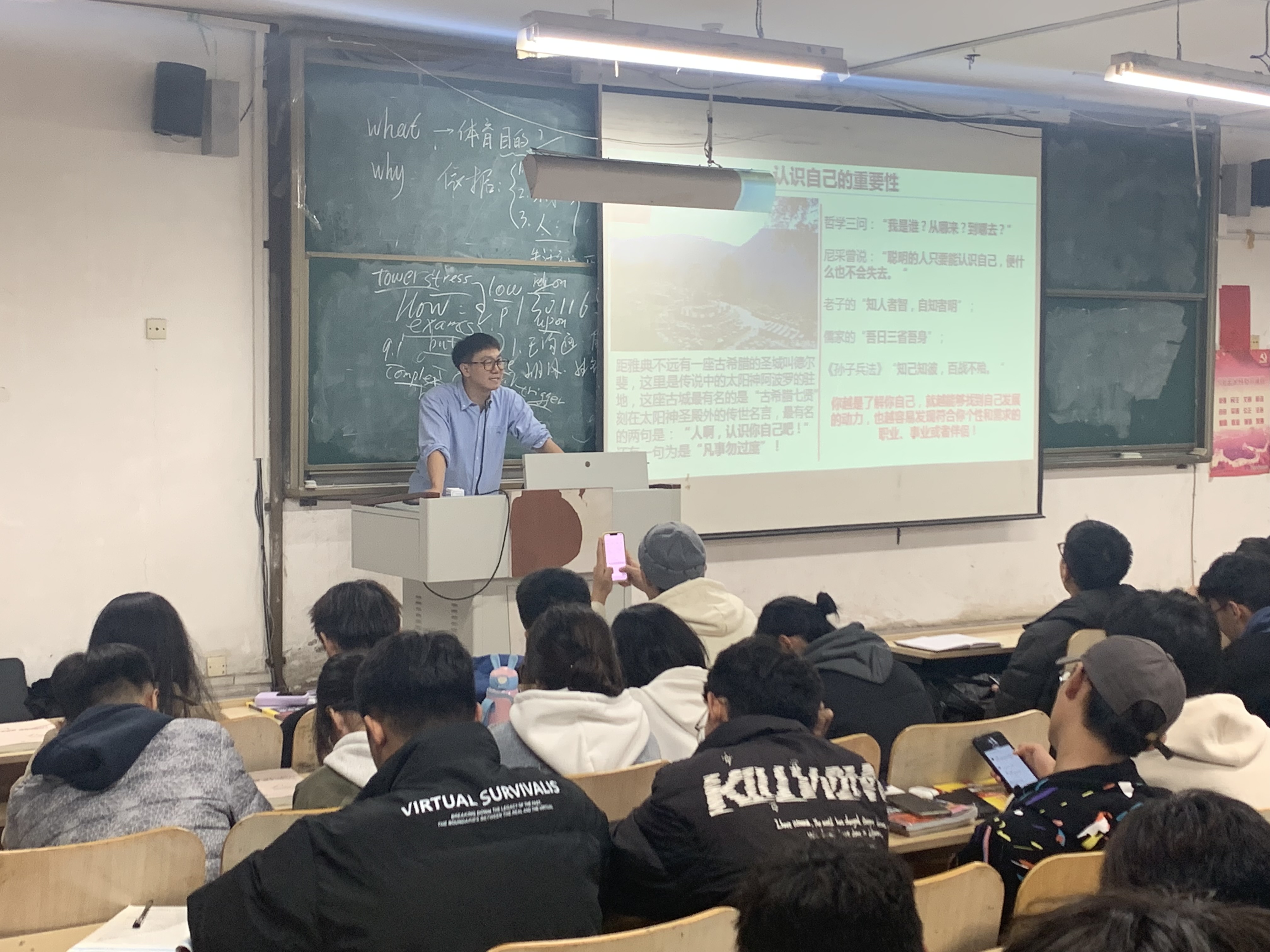 首先,孙老师用幽默的语言、生动的插图阐述了大学生常见的困惑,引起学生们的共鸣。他从如何正确认知大学,怎样适应自己的大学,如何培养自己的大学能力三个部分进行阐述。运用相关数据统计,说明目前就业状况的严峻,并指出大学生进行职业规划的重大意义。最后师生互动,进行性格测试,同学们在轻松氛围中上交自己职业规划书。孙老师的课结合实例,深入浅出,层层递进,及时雨般解决很多学生心中的疑惑。整个过程紧张有序,气氛愉悦。