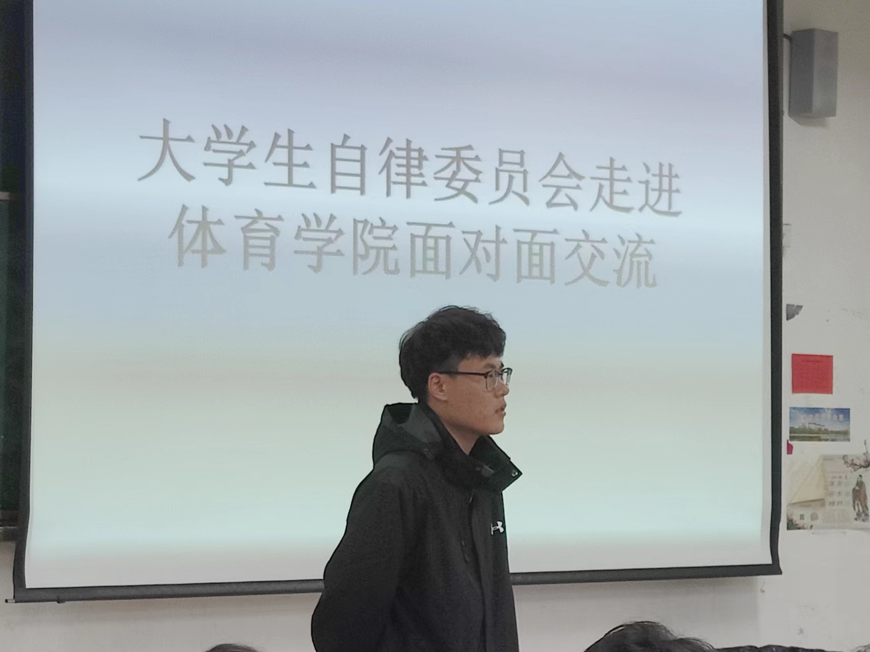 活动伊始,苏晨雨同学向同学们讲解此次活动主要目的,各部门负责人自我介绍并简述所负责部门的工作内容。随后,体育学院团总支学生会部门负责人针对举办活动发现的一些问题,进行提问交流。大学生自律委员会代表对以上问题做出积极回答,并明确表示,在处理特殊及突发情况时,坚持特殊情况特殊对待,保证做到公平公正。活动最后,双方对活动内容进行补充和解释。