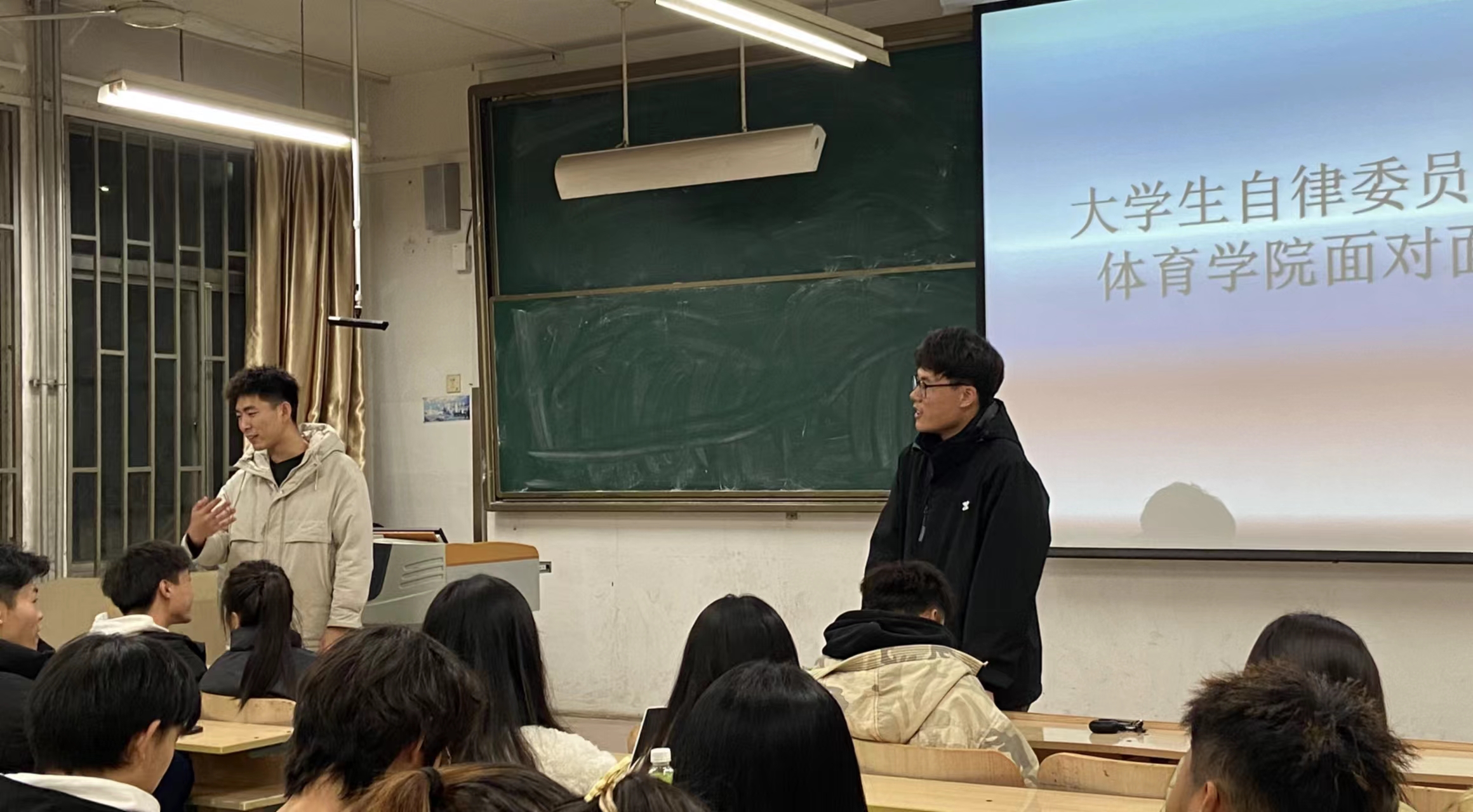 为促进体育学院团总支学生会与大学生自律委员会的工作交流,更好地协调开展工作。近日,体育学院团总支学生会在T110教室开展“大学生自律委员会走进体育学院面对面交流”活动,此次活动由体育学院团总支学生会主席团成员苏晨雨同学主持,体育学院团总支学生会各部门负责人及大学生自律委员会成员参加。