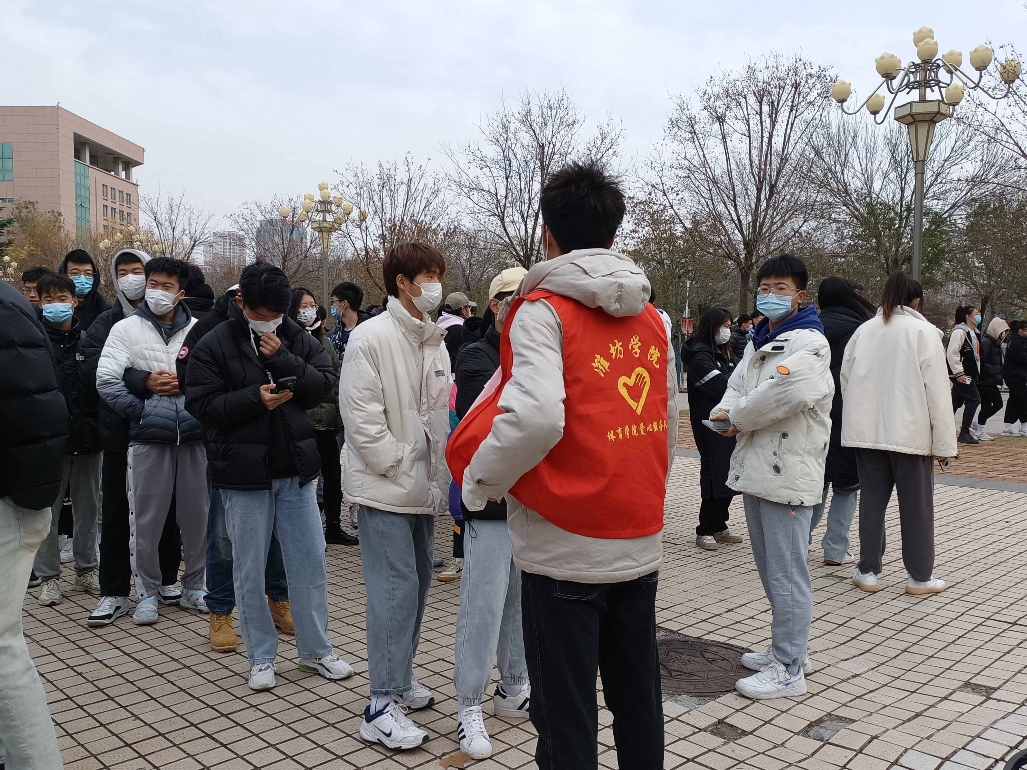 为积极响应学校疫情防控号召,贯彻落实细化各项疫情防控工作,更好的应对潍坊市突发疫情,促进高效、高质的完成全员核酸检测工作。11月27日早上10点,体育学院学生干部积极投入到志愿者服务队伍,组织学生有序进行核酸检测工作,全力协助学校疫情防控工作,助力核酸采样。