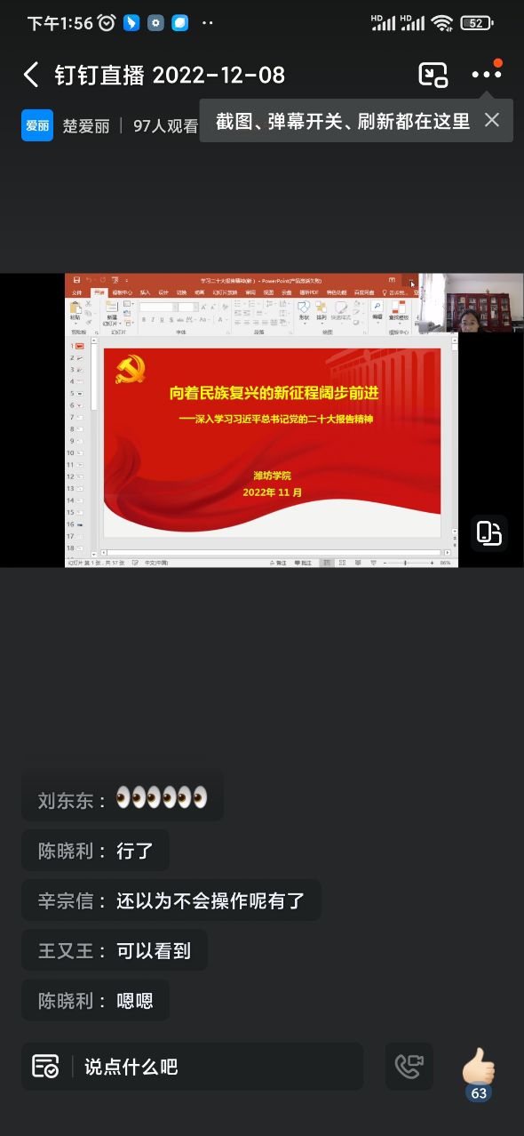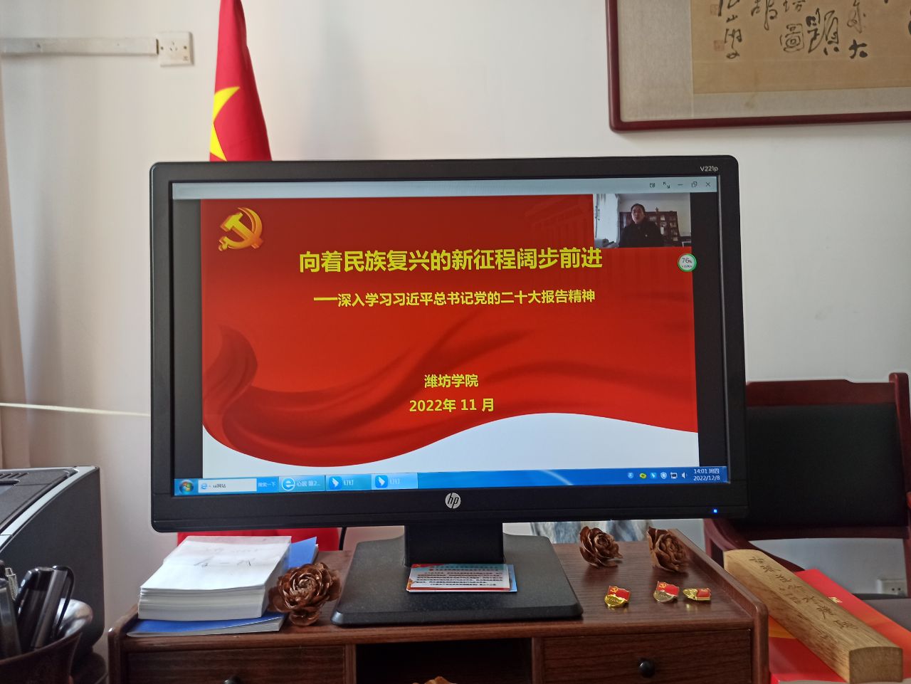 为深入学习宣传贯彻党的二十大精神,感悟思想伟力、厚植教育情怀、激发奋进动力,根据学校党委的要求,12月8号下午,学校宣讲团成员、马克思主义学院楚爱丽教授以“向着民族复兴的新征程阔步前进——深入学习习近平总书记党的二十大报告精神”为题,通过线上方式给体育学院、音乐学院全体教师宣讲了党的二十大精神。