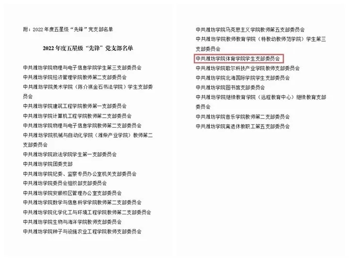近日,潍坊市委教育工委印发《关于命名五星级“先锋”党支部的通报》,经党支部自评、学校党委考评和市委教育工委复核,中共潍坊学院体育学院学生支部委员会荣获2022年度五星级“先锋”党支部称号。