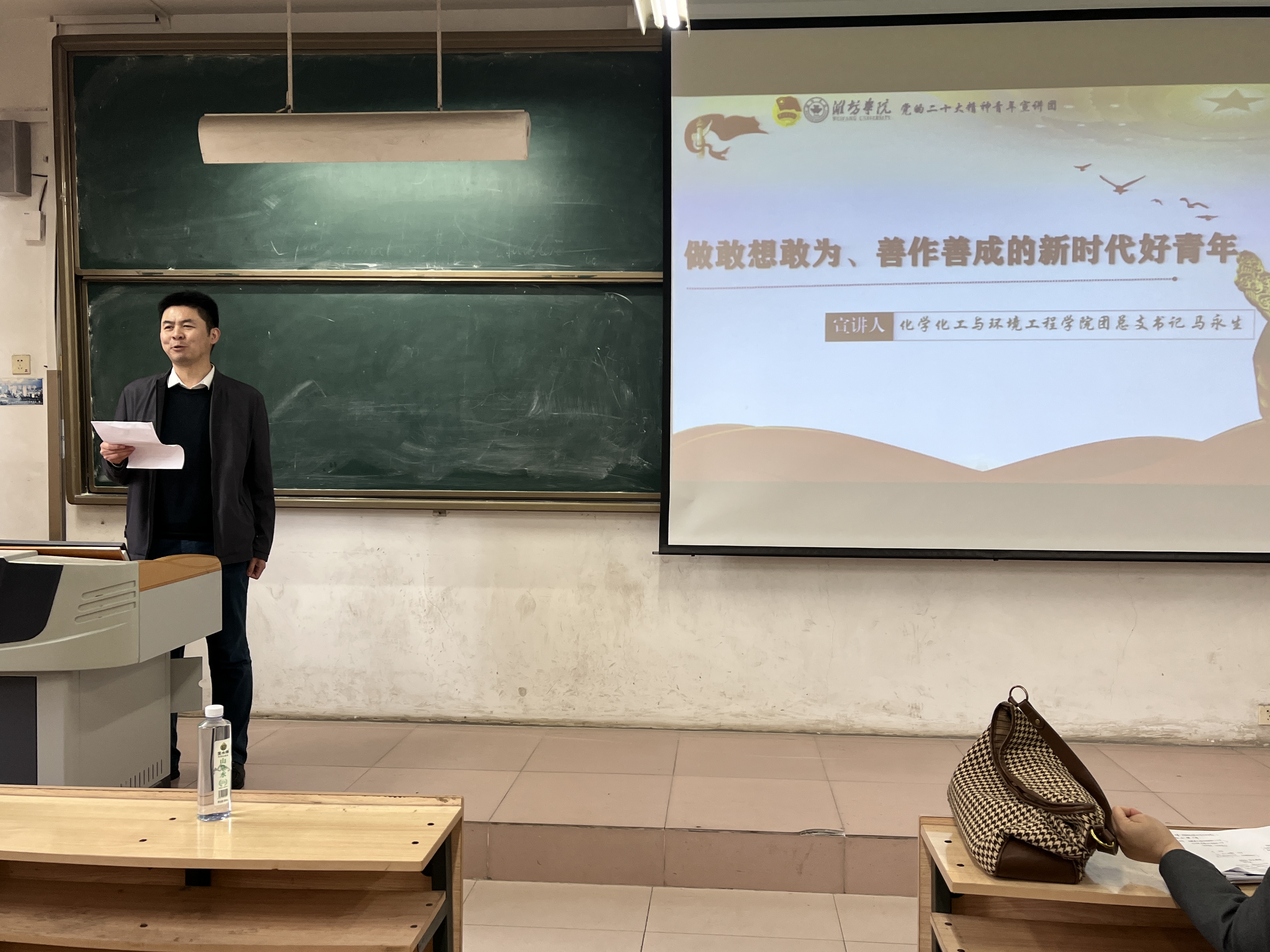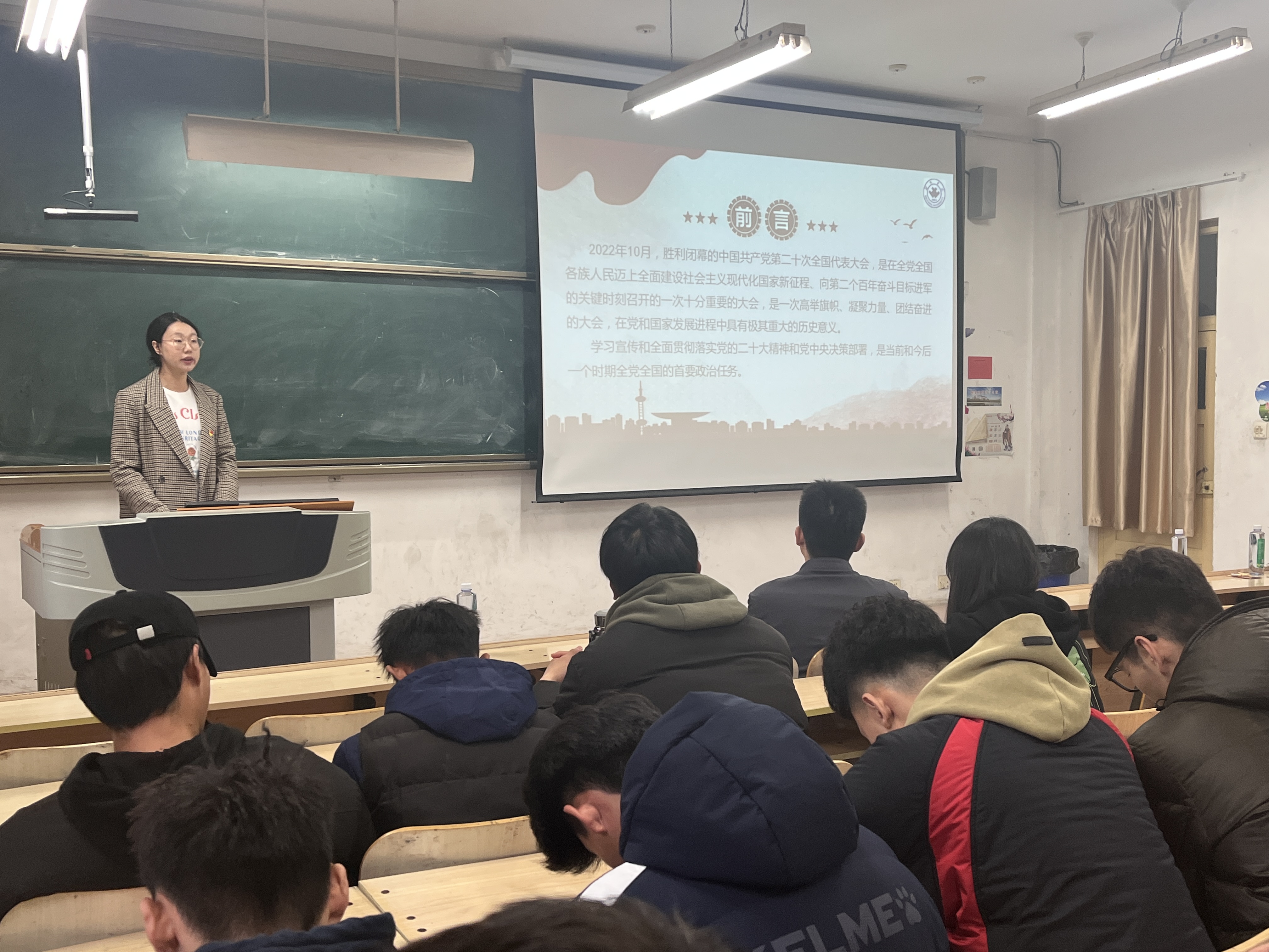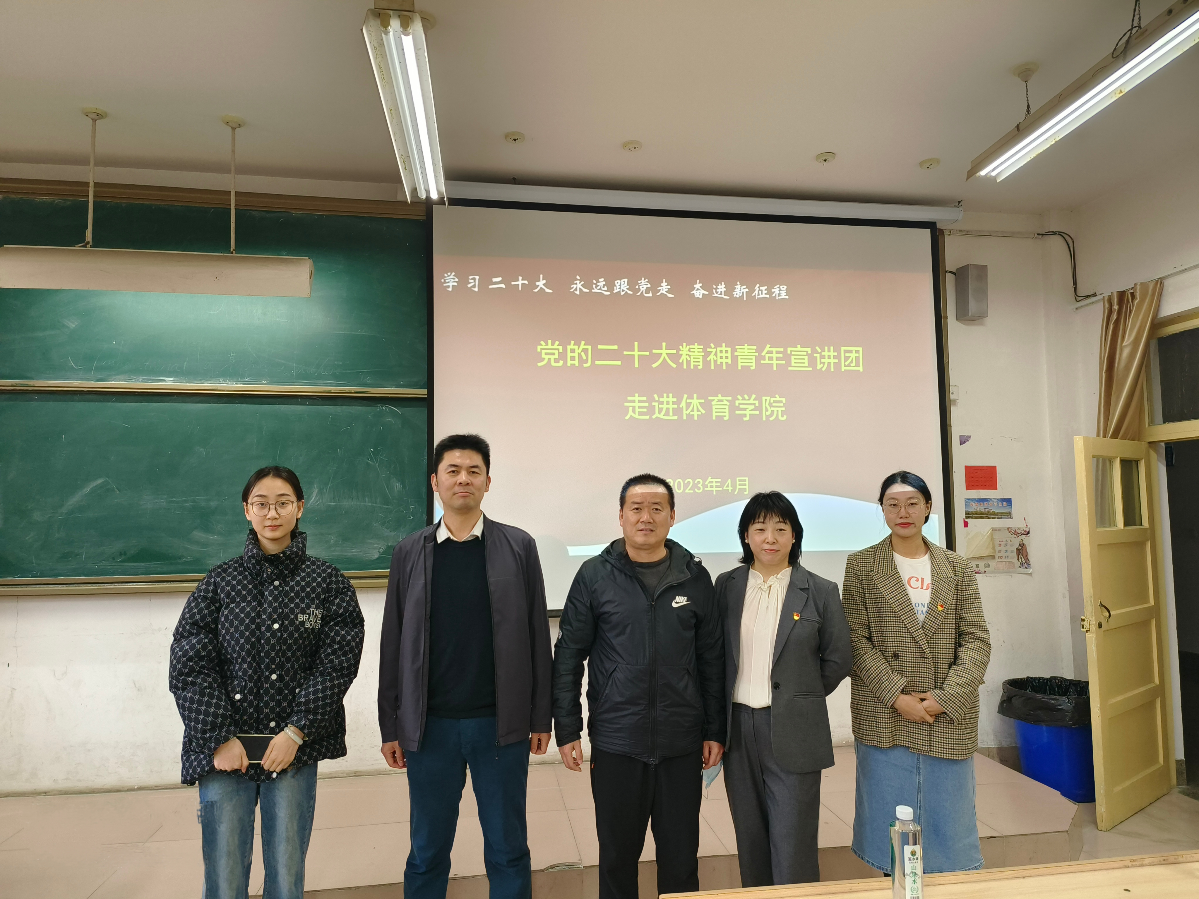 为深入学习贯彻中国共产党第二十次全国代表大会精神,以青年之声传递青年理想,凝聚青年力量。4月6日下午,化学化工与环境工程学院团总支书记马永生老师、中国化马克思主义教研室副主任高海杰老师、计算机工程学院周晓晗同学、教师教育学院尤晓彤同学一行来到体育学院T110教室开展二十大教育宣讲,校运动队全体人员参加此次宣讲会。