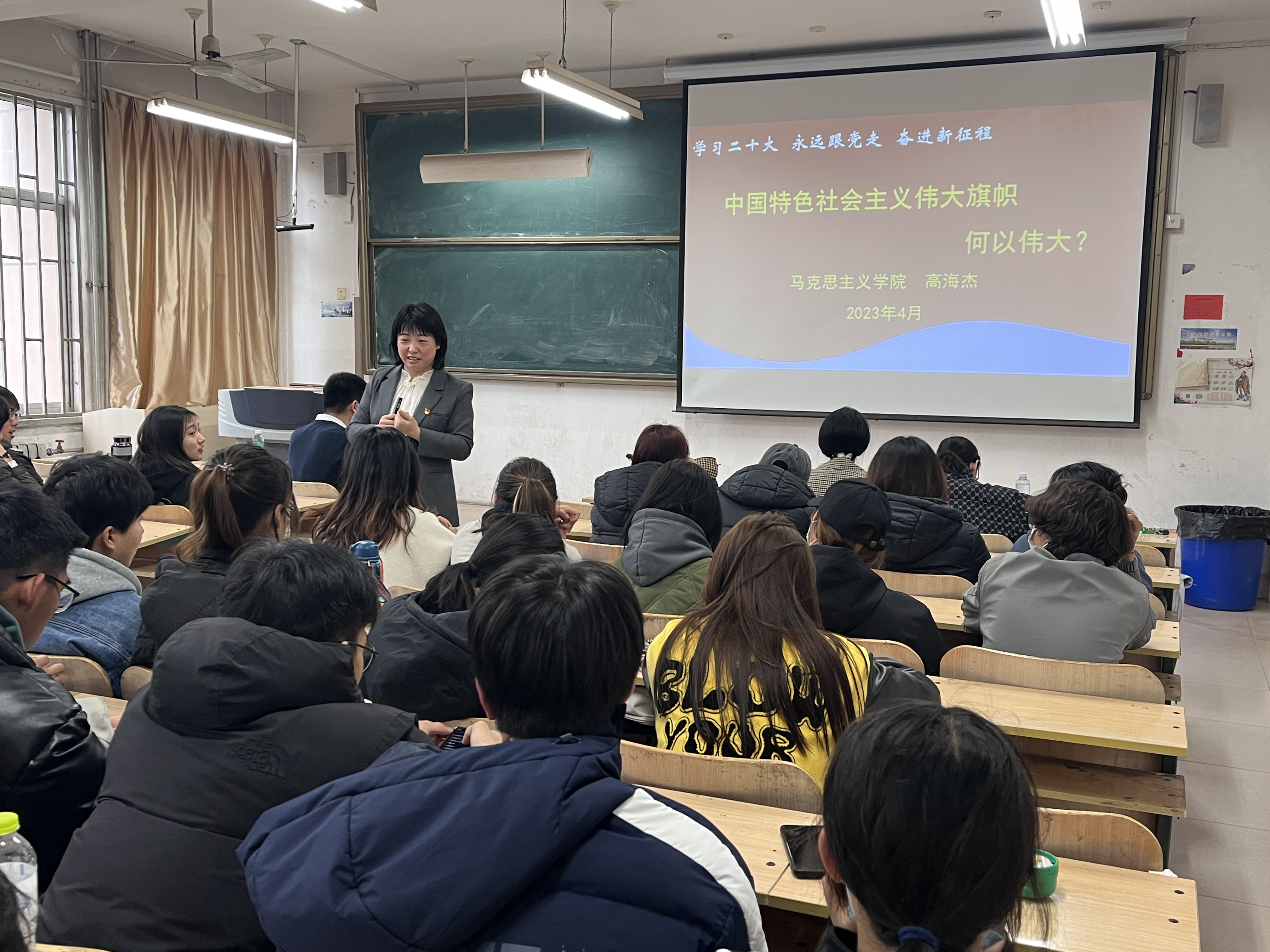 宣讲会开始,马永生老师指出青年是最活跃的社会力量。新时代,中国青年生逢盛世,肩负重任,为实现中华民族伟大复兴的中国梦而奋斗,是当代青年难得的人生际遇。紧接着,高海杰老师以“中国特色社会主义伟大旗帜何以伟大”展开宣讲,带领同学们从回忆历史、比较现实、眺望未来三方面介绍了中国共产党第二十次全国代表大会报告主题及伟大建党精神。