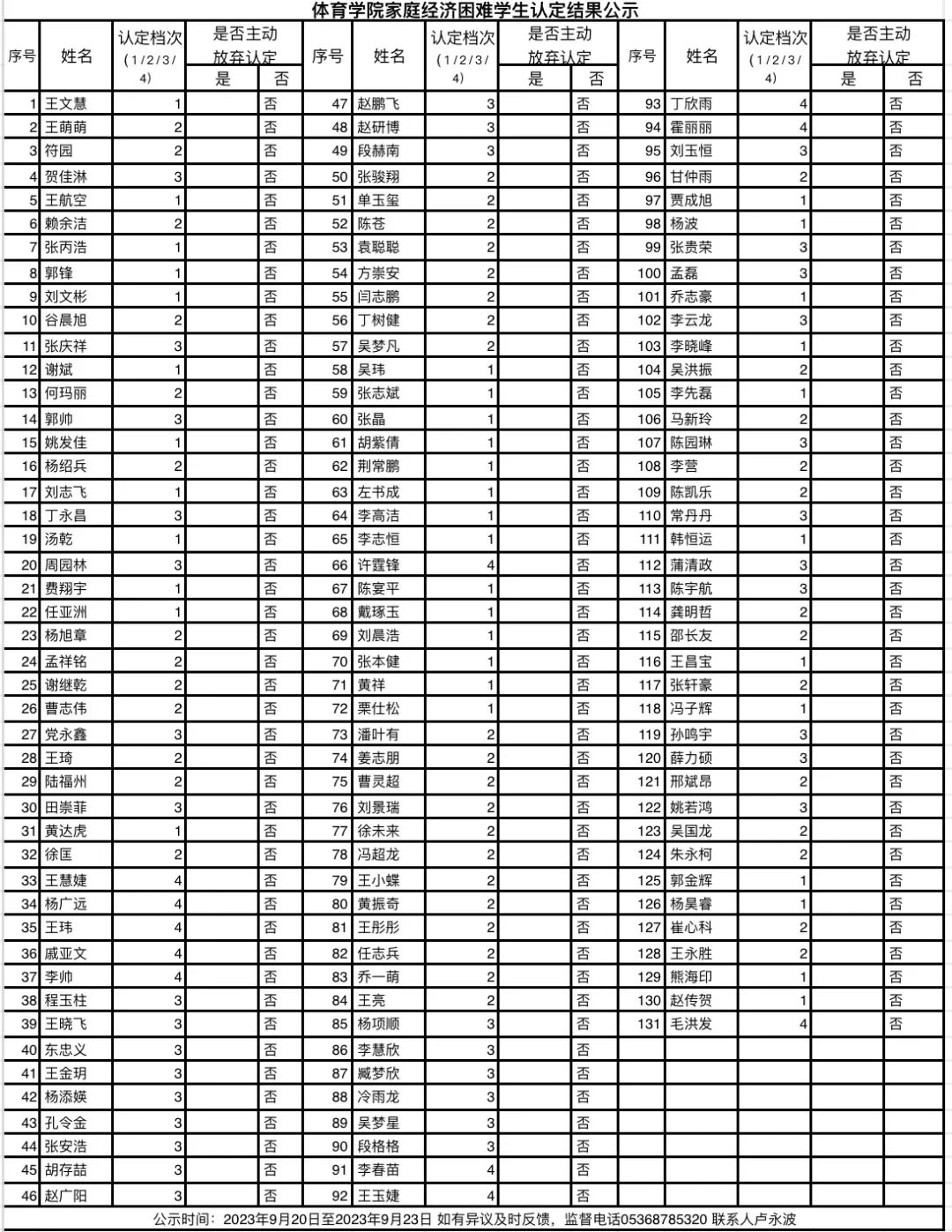 体育学院家庭经济困难学生学院认定小组评议结果公示