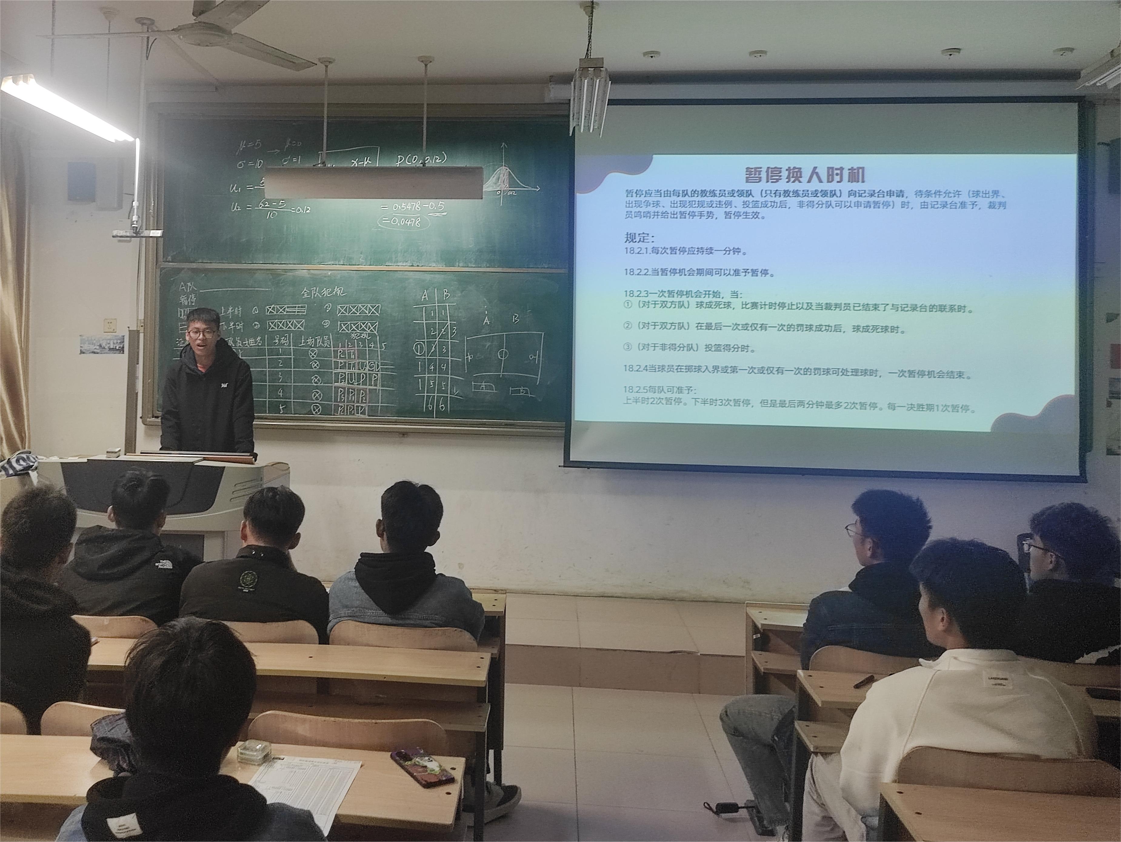 为确保“迎新杯”篮球比赛的顺利进行,规范篮球比赛的记录工作11月5日下午,大学生篮球协会于T110教室举办篮球记录台培训活动。本次培训由22级潘清怡和柳超驰主讲,23级篮球爱好者参与本次培训。