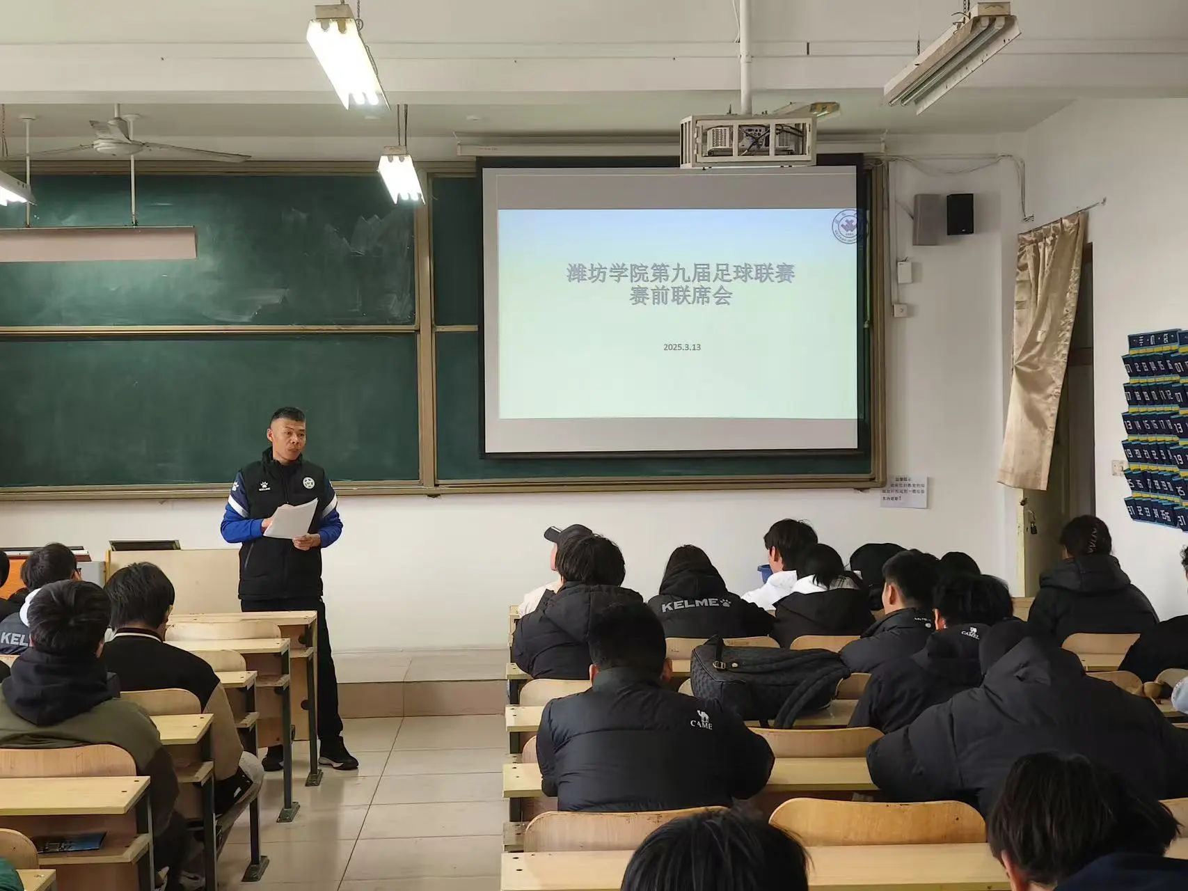 为了迎接即将到来的第九届足球联赛,保证联赛顺利举行。体育学院于3月13日在T303召开潍坊学院第九届足球联赛赛前联席会暨裁判员会议,此次联席会旨在维持良好的足球比赛秩序,促进足球比赛工作常态化开展,鼓舞我院足球队队员士气,弘扬团结协作的体育精神。