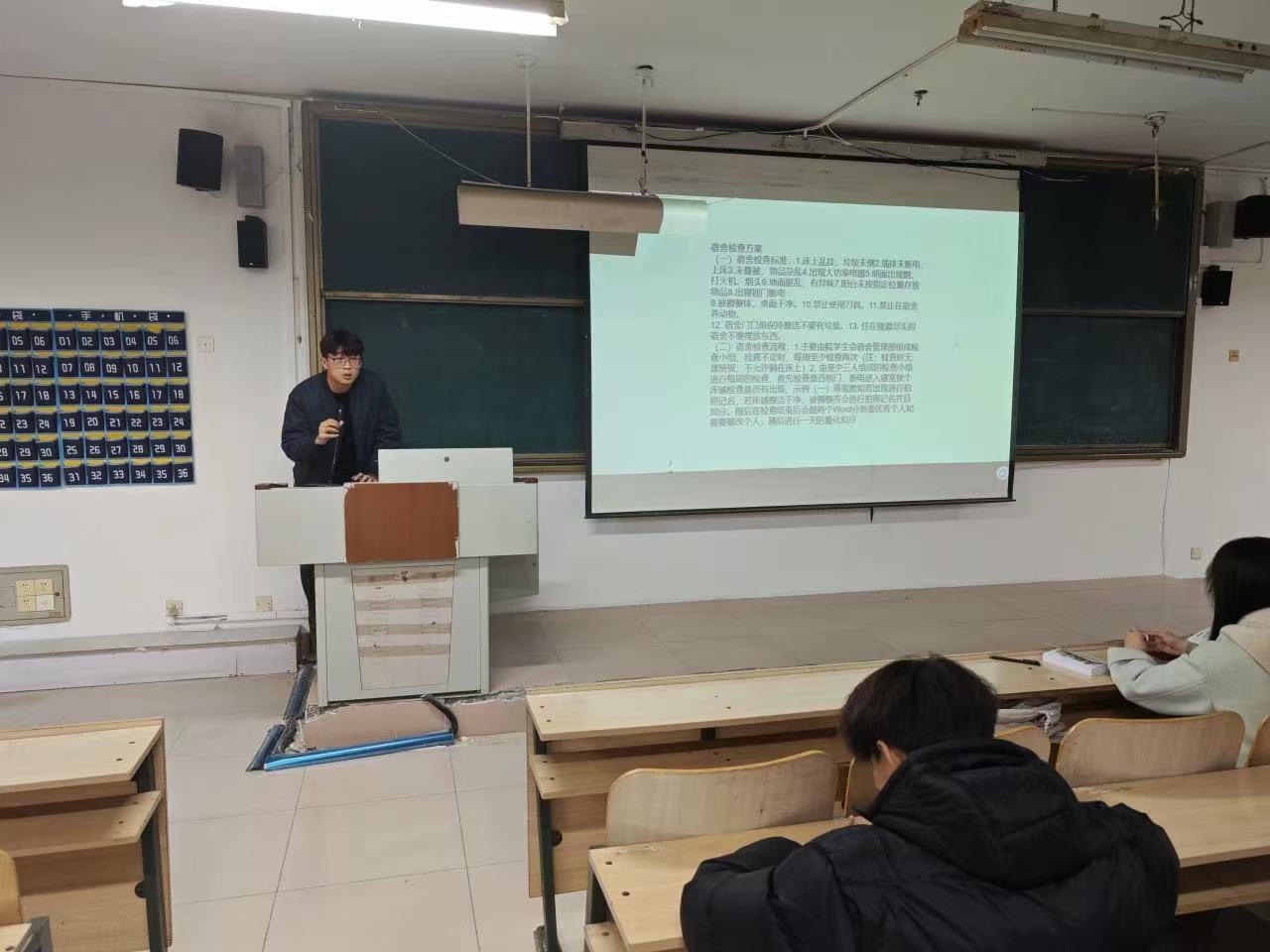 会议伊始,张佩吉明确阐述了本次会议的核心目标,强调学生公寓不只是学生日常休息的地方,也是育人的关键场所。为了防止公寓内出现安全风险、卫生问题以及管理上的混乱,从而影响学生的居住环境和身心健康,宿管部及其他相关部门将高度关注,并开展彻底的整治工作。张佩吉指出,院学生会宿舍管理部将成立检查团队,进行不定期的检查。又向同学们详细介绍了宿舍检查的具体标准。这些标准涵盖了公寓内的卫生状况、物品摆放、用电安全等多个方面,确保每一个细节都能得到关注。会议最后,张佩吉对同学们提出了殷切希望。他希望同学们能够认真对待这次整顿工作,积极配合宿管部的工作安排,共同为学生公寓的改善贡献自己的力量。