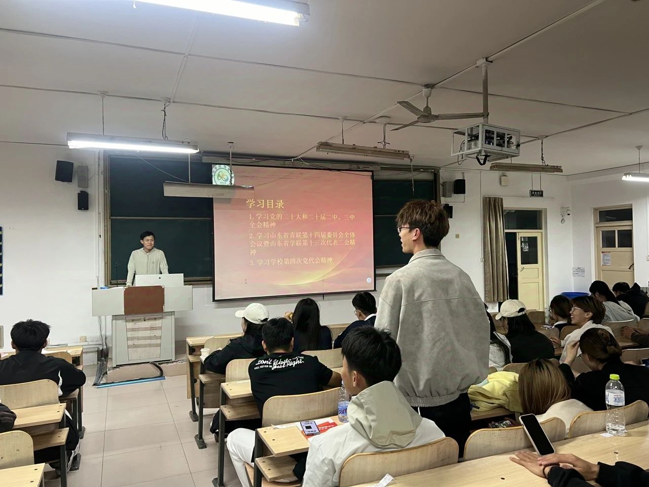 4月23日,全体学员在T301教室集中学习党的二十届二中全会、三中全会精神及山东省青联、学联会议精神。课程采取“领学+研讨”模式,并结合体育专业特点,探讨如何将“体育强国”战略融入学生工作。学生会成员分组围绕“新时代青年使命”“学生会改革路径”等议题展开讨论,且发表了思想感悟。理论学习为学生会成员树立了坚实的政治引领。