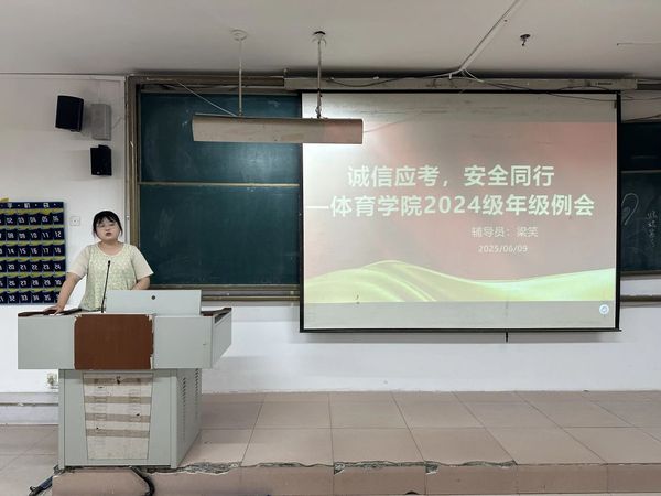 为强化学生诚信意识,严肃期末考试考风考纪,营造公平公正的考试环境。6月10日,体育学院在T301教室开展诚信应考主题会议。2024级辅导员梁笑作为主讲,2024级全体学生参与本次会议。
