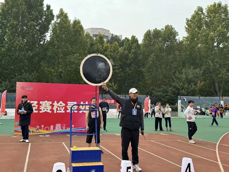 开幕式上,2024级学生组成的彩旗队率先登场,64名旗手迈着整齐划一的步伐,手中五彩旗帜在风中舒展翻飞,旗帜交织成流动的青春画卷。经过前期的训练,他们的举旗、摆臂、步伐高度协同,每一次挥旗都传递着团结向上的力量,成为开幕式上最亮眼的风景线。随后,潍坊联通各代表队身着统一队服,喊着嘹亮口号依次入场,展现出企业员工的昂扬斗志。赛事的公平公正,离不开体育学院教师裁判团队的专业守护。赛前,老师们深入研习竞赛规则,开展执裁培训,明确流程标准;比赛中,他们坚守各点位岗位,起点处精准发令,赛道旁严谨监督,终点线前细致记录,用精密校准的仪器与毫厘必较的态度守护竞技公平。