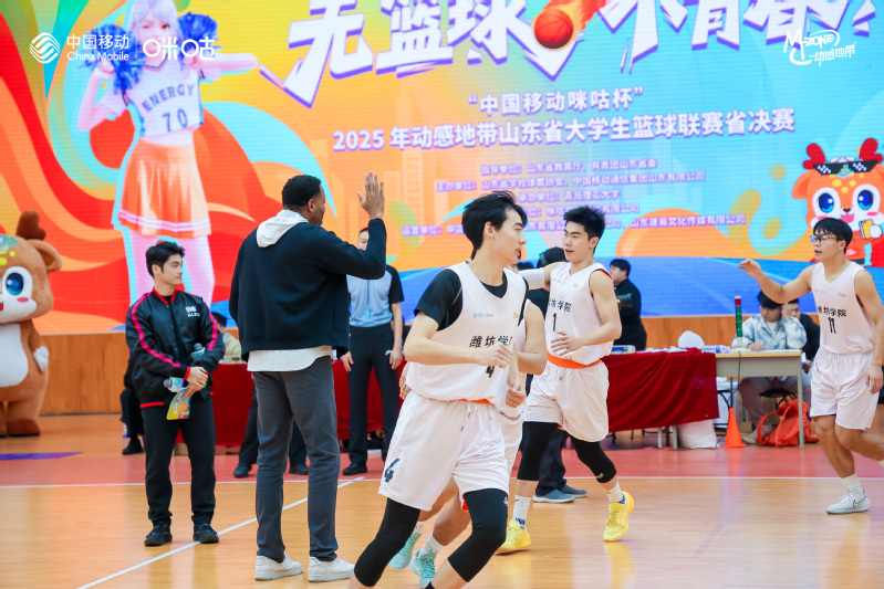 本次赛事山东移动以 5G-A 技术构建的 “超高清直播 +线上互动”多维观赛矩阵,让未能到场的潍坊学院师生通过咪咕视频也能实时见证球队的拼搏历程。NBA传奇球星罗伯特・霍里的现场助阵、篮球达人曹岩、曹芳、徐通等参与中场互动,更为这场青春盛宴增添了潮流色彩。