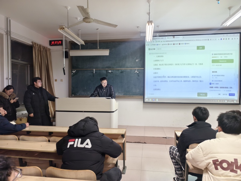 为传承“一二・九” 运动爱国精神,保障赛事公平公正开展。2025 年纪念 “一二・九” 运动大学生拔河比赛裁判组专题会会议室隆重召开。本次会议由体育学院团委负责人孙圣林及赛事裁判组核心成员吕景琦、唐殿昊担任主讲人,全体裁判员及赛事组织工作人员参会,共同为即将启幕的拔河比赛筑牢执裁基础。