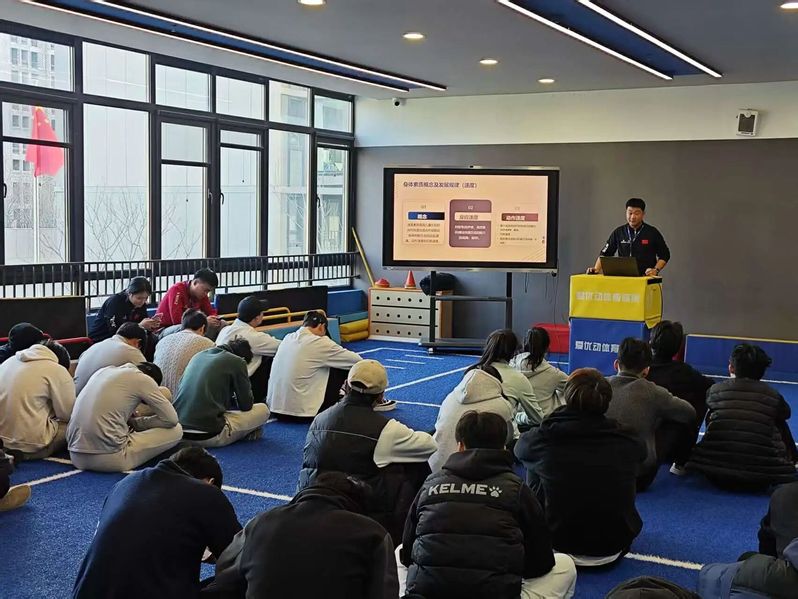 活动伊始,爱优动高老师详细介绍了企业的文化背景、发展历程及取得的专利、奖项等荣誉,同时介绍了企业优秀教练团队与董事长相关情况并观看企业宣传片,让同学们对企业及行业发展有了全面认知。随后,同学们在企业老师带领下体验了AI智能跳远项目,感受科技赋能体育的创新模式。刘老师结合案例,分享了特殊儿童体育教学的相关经验与技巧。姜老师则围绕灵敏性、柔韧性、平衡、耐力、协调性等身体素质训练要点,讲解了不同年龄段体育课程的标准化流程,涵盖热身、定点教学、循环教学及教学方法与动作示范等内容,干货满满。最后,关老师带领大家开展趣味热身游戏,并指导完成规范的拉伸放松动作,强化同学们的运动安全理念。