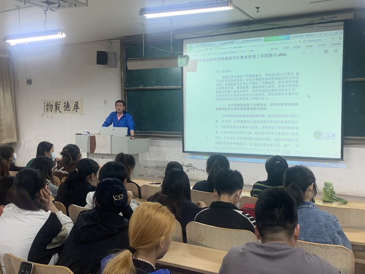 会上,卢老师围绕当前疫情防控形势、在校生日常管理、健康责任教育等问题进行讲解。充分肯定了同学们在学校相对封闭管理的特殊时期,顾大局、识大体的主人翁意识。向同学们讲明白解释清楚学校实行相对封闭管理的必要性,引导同学们继续做好学校相关疫情防控要求,巩固好来之不易的防控成果。要求同学们强化“每个人都是自己健康第一责任人”的意识,加强对防控法规和制度的学习,增加对个人防护与消毒等知识技能的学习掌握。号召全体同学,在校园相对封闭管理期间要严格遵守学校有关规定,配合学校,与学校同频共振,共同努力,做好疫情防范工作,打赢疫情防控阻击战、歼灭战。