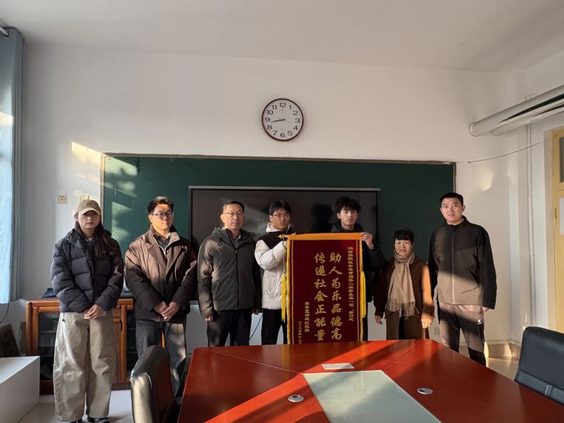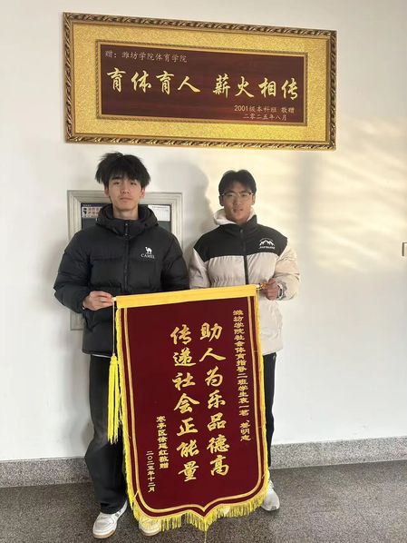 12月9日,一面写有“助人为乐品质高,传递社会正能量”的锦旗被市民徐女士送至体育学院T206教室,赠予社会体育指导与管理专业2025级学生袁一茗、姜明志。